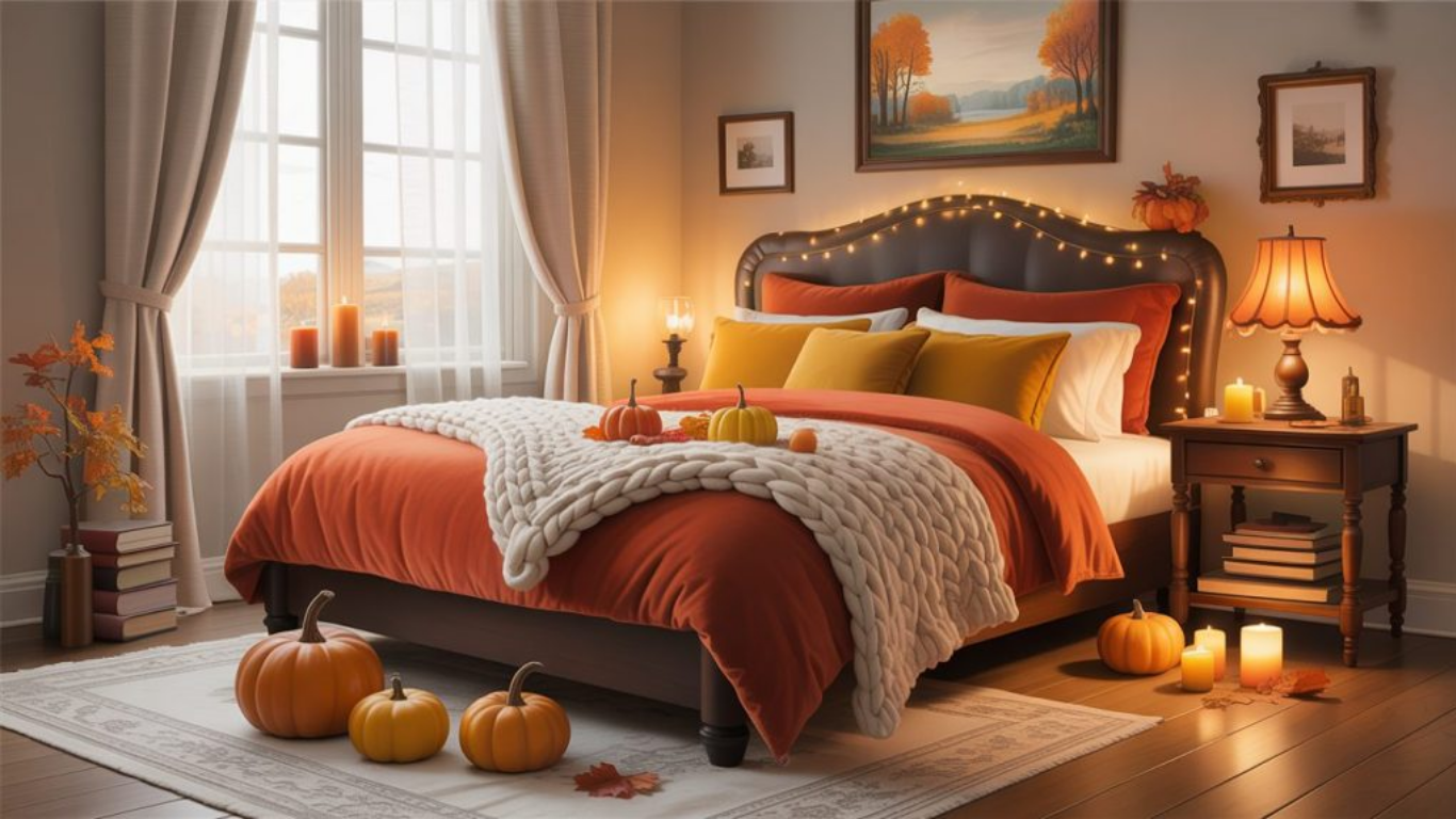 Larger spaces allow for more dramatic Fall Bedroom Decor Ideas. A feature wall painted in a rich autumn shade can instantly anchor the room and create visual depth. High-quality seasonal bedding, such as velvet duvets or thicker layered linens, enhances both style and comfort. Statement decor pieces, including large vases filled with seasonal branches or oversized pumpkins, can fill empty corners beautifully. In a master bedroom, the goal is to create a restful retreat that fully embraces the warmth and richness of fall while maintaining a balanced and elegant look.