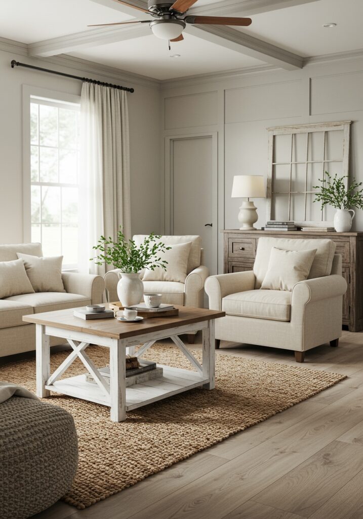 Farmhouse Living Room Ideas work best with neutral colors and natural materials