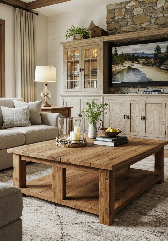 Nothing defines farmhouse style better than wood. I’ve found that even one solid wooden piece—like a coffee table—can anchor the entire room. Reclaimed or slightly distressed wood works best because it adds character.