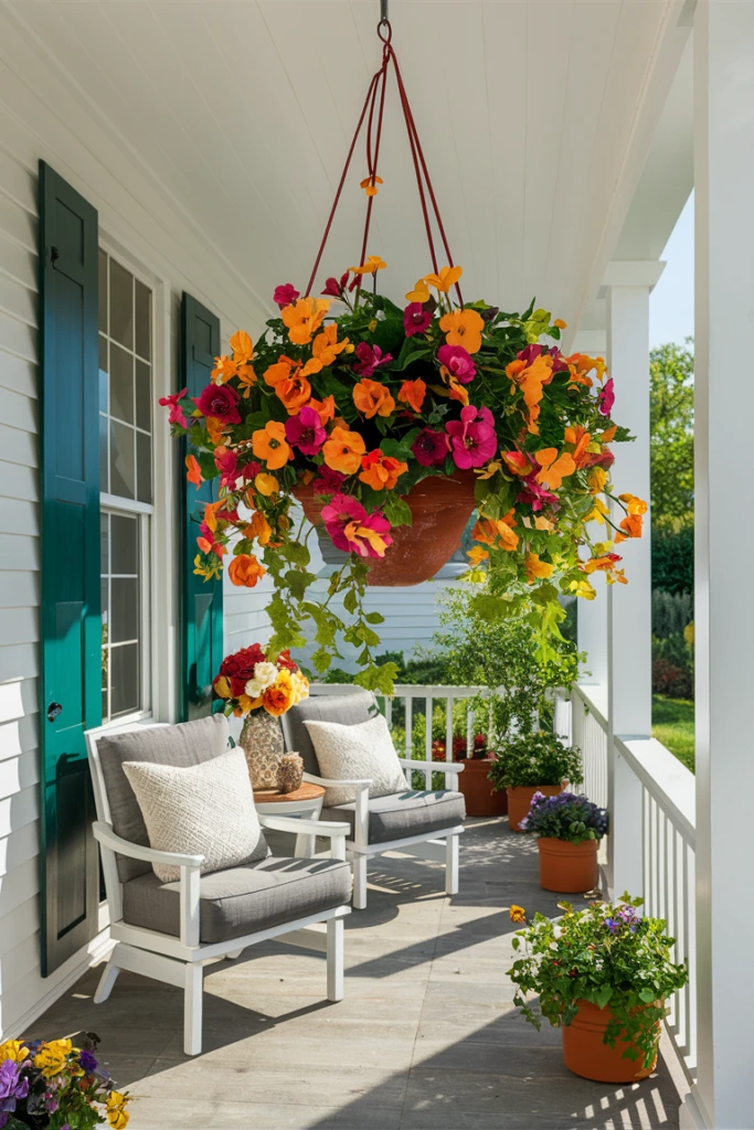To add color and dimension, I frequently style UV-resistant hanging flowers above seating areas or near the doorway. Their bright blooms attract attention while drawing the eye upward, making the porch feel more dynamic. Because they are designed to resist sun exposure, they keep their vibrant look and continue enhancing the space all year long.