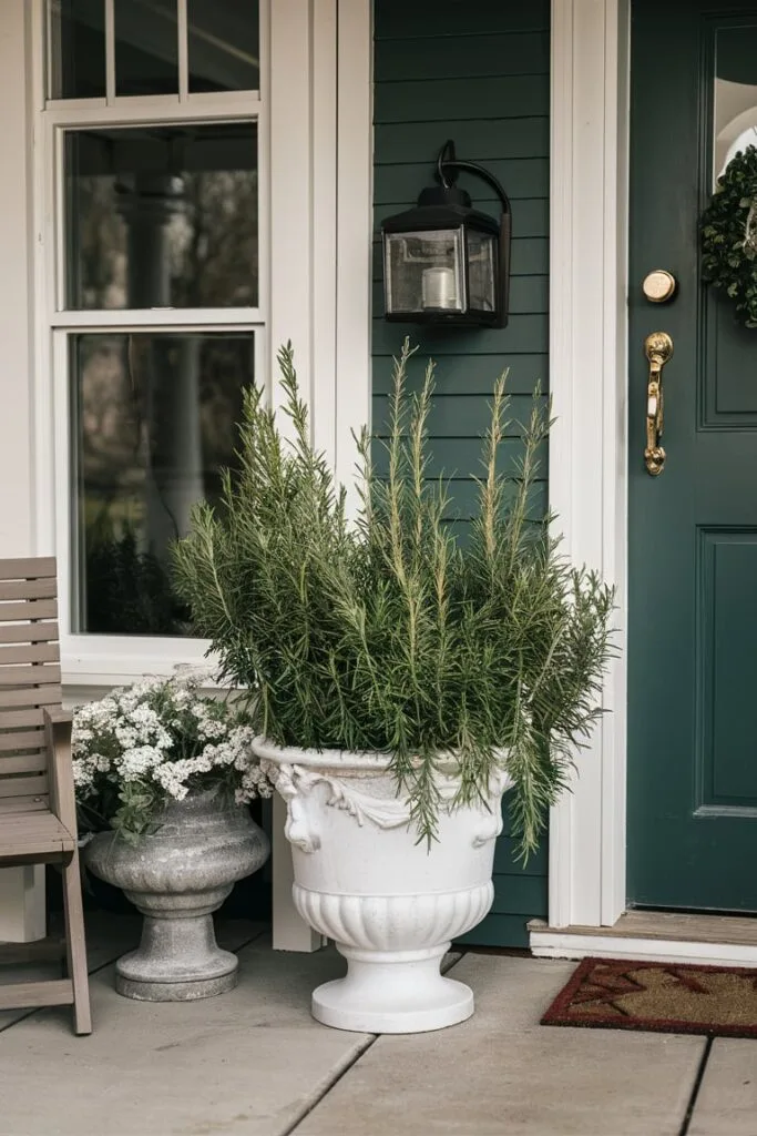 For subtle greenery, artificial rosemary sprigs are a simple yet refined addition to porch styling. Their slim, natural-looking leaves work well in small planters and pair nicely with other decorative plants. I often use them to add light greenery that enhances the design without overwhelming the space.
