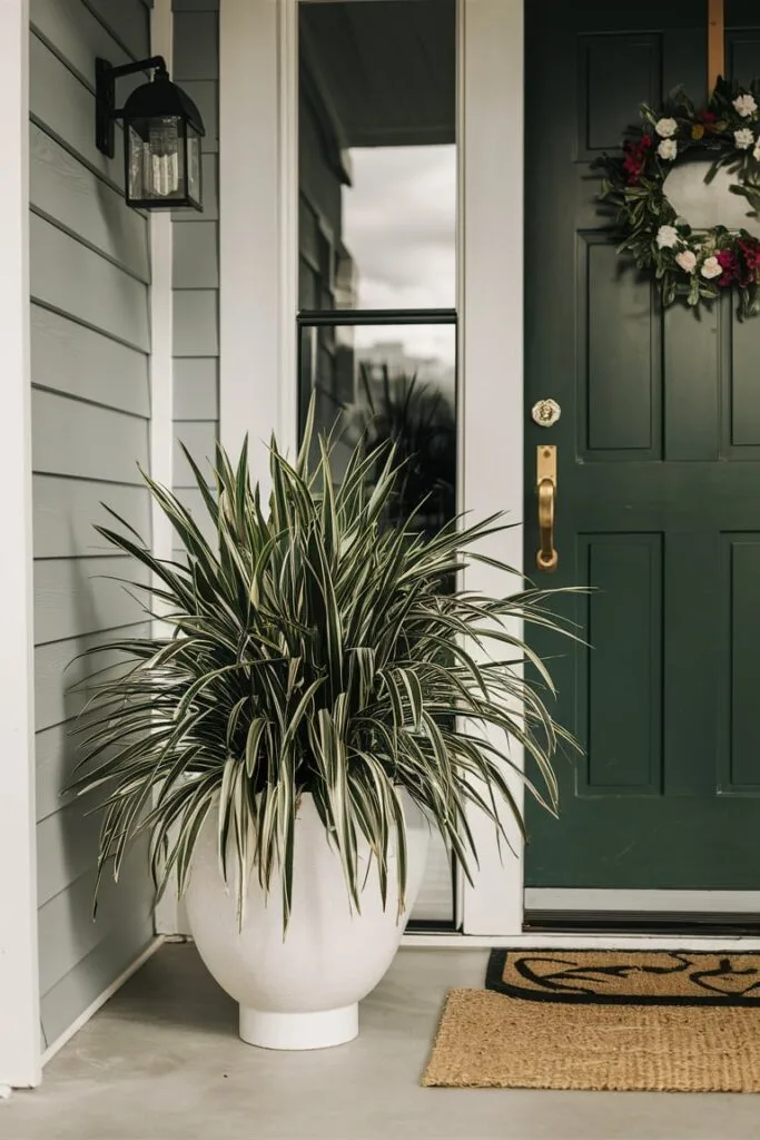 To create height and movement in porch arrangements, I often use artificial zebra grass in tall planters. The narrow blades add texture while maintaining a clean and modern appearance. Positioned near steps or corners, this decorative grass frames the entry area and gives the porch a balanced, contemporary feel.