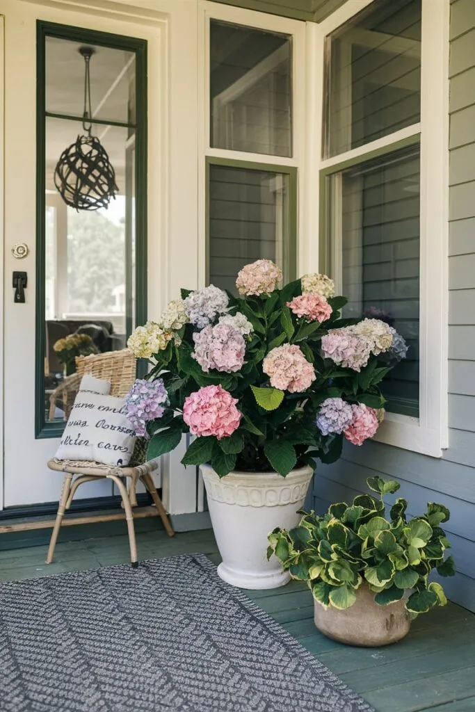 A faux hydrangea bush adds cheerful color and traditional charm to porch decor. I like styling these in ceramic or wooden planters near the entryway where the full blooms can brighten the space. The artificial version keeps its vibrant appearance without pruning or watering, making it perfect for homeowners who want long-lasting floral beauty.