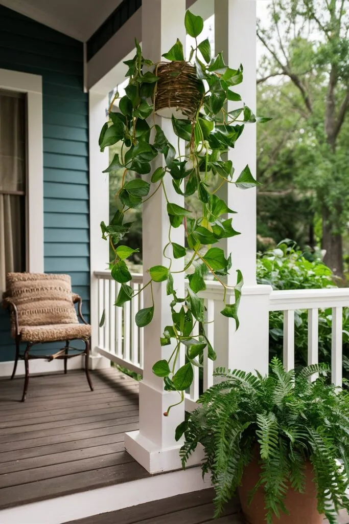 A UV-protected pothos vine is excellent for adding flowing greenery across a porch design. I usually wrap it around columns or let it trail from hanging planters to create a relaxed and layered look. Its lifelike leaves introduce softness and warmth while the UV protection ensures the vine keeps its vibrant color in bright outdoor conditions.