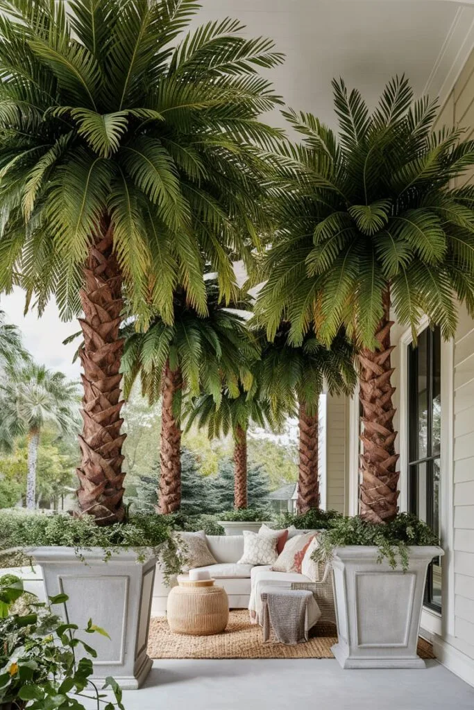 When clients want a tropical atmosphere, I often suggest faux palm trees for their dramatic and sunny appearance. The wide fronds instantly create a vacation-like vibe on the porch. Placing them in tall planters near seating areas helps anchor the layout and brings a lively, resort-inspired feel to the space.