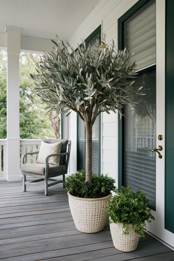 A realistic olive tree brings a Mediterranean feel to front porch styling. I like placing one or two near the entrance in rustic pots to create a balanced and welcoming arrangement. The soft gray-green leaves provide subtle texture, helping the porch feel refined and relaxed while maintaining a natural outdoor atmosphere.