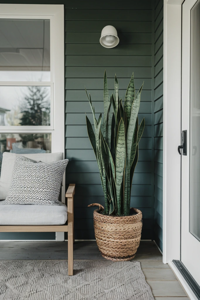 For modern porch layouts, I frequently recommend faux snake plants because their upright leaves create a clean and structured look. They fit well in narrow corners or beside seating areas where vertical greenery is needed. Their sleek shape works particularly well with minimalist and mid-century inspired porch decor, adding style without cluttering the space.