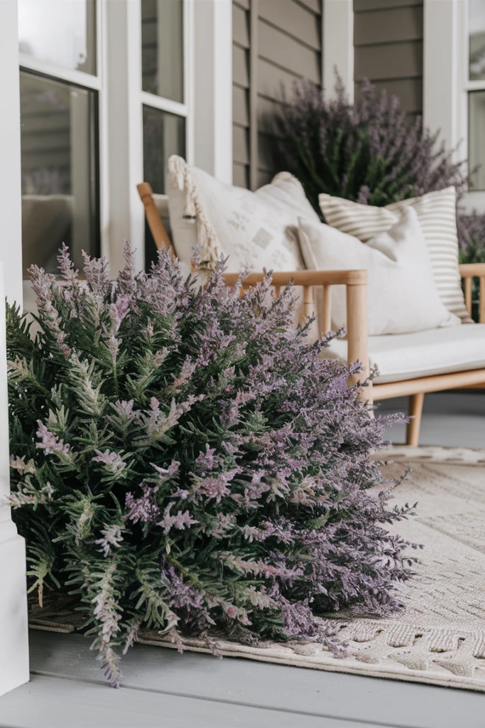 In cottage-style porch designs, I often add artificial lavender bushes to introduce soft color and charm. The purple blooms pair beautifully with wood furniture, neutral tones, and rustic planters. Faux lavender provides the peaceful look of flowering plants while staying bright and neat throughout the year without watering or seasonal care.