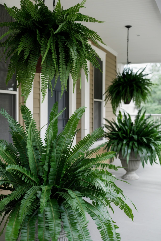 A faux Boston fern is one of my go-to choices when creating lush porch greenery. The layered fronds add volume and texture, instantly making the entryway feel fuller and more inviting. Hanging baskets or tall planters allow the fern to cascade naturally, helping frame the doorway while adding a vibrant tropical character to the outdoor decor.