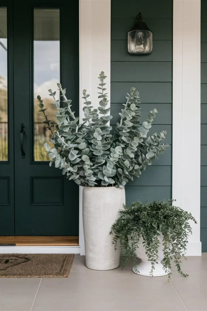 For homeowners who prefer a calm and refined look, I often style UV-resistant eucalyptus stems in simple outdoor planters. Their soft green color and delicate leaf shape bring subtle elegance to a porch design. These faux stems also work well in mixed arrangements with artificial flowers, allowing you to build stylish displays that maintain their fresh appearance even in direct sunlight.