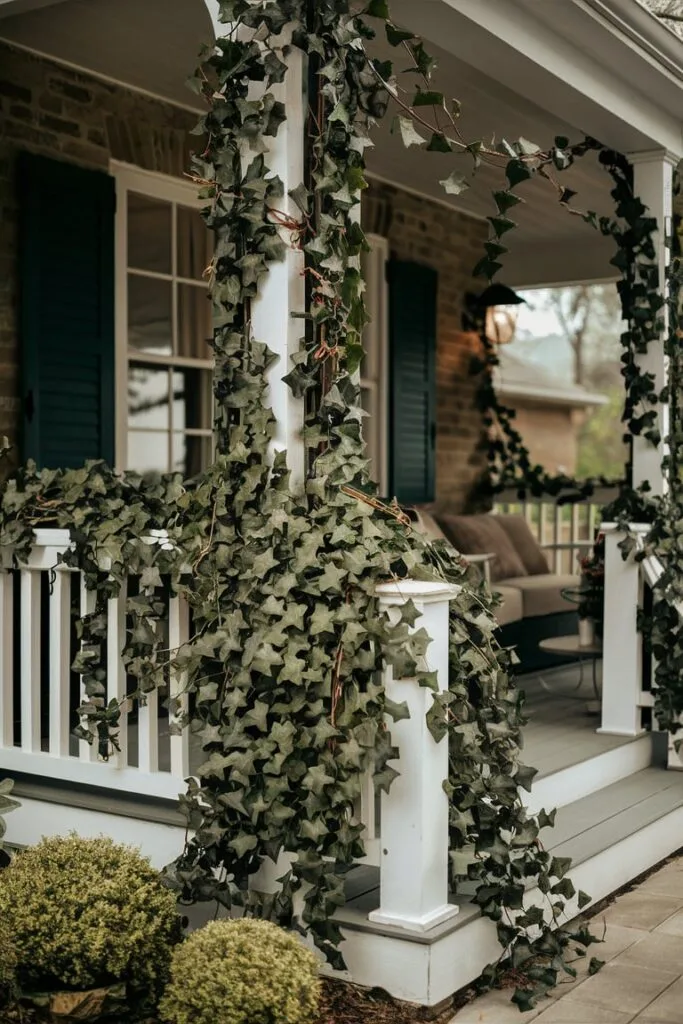 When designing cozy porch spaces, I frequently use cascading faux ivy to introduce softness and natural movement. Draped over railings, planters, or decorative trellises, it adds a relaxed garden feel without the upkeep required by real ivy. The layered leaves create texture and depth, helping the porch feel lively and welcoming while remaining completely maintenance-free.