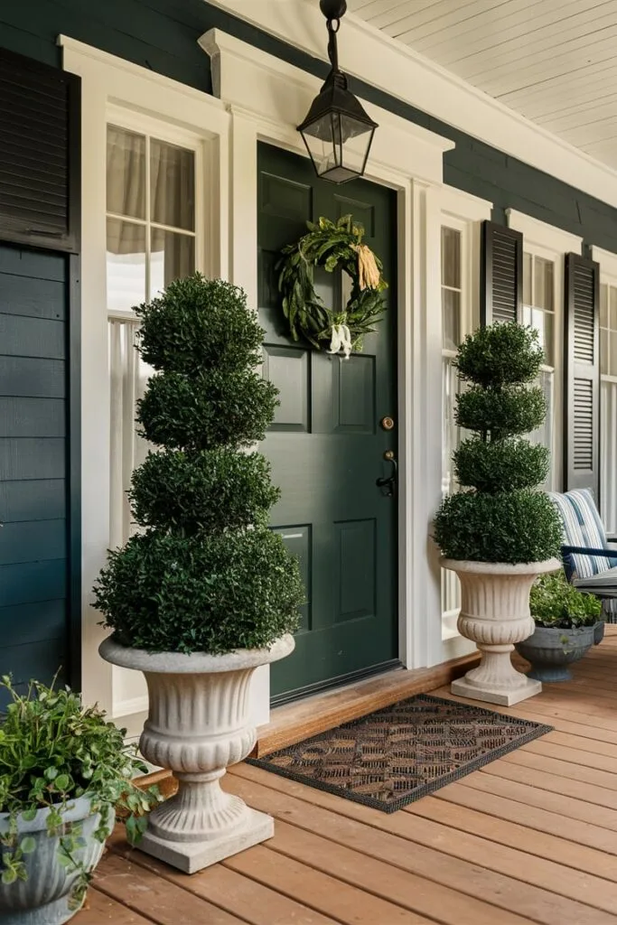 I often recommend artificial boxwood topiaries for homeowners who want a timeless and structured front porch look. These neatly shaped plants add symmetry and refinement, especially when placed in elegant urn planters. Positioned beside doorways or along steps, they create a balanced entrance design that suits traditional homes as well as modern properties that need a touch of classic charm.