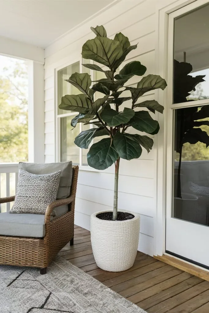 In my porch styling projects, the faux fiddle leaf fig is one of the most impactful faux plants for front porch displays because of its height and bold presence. Placing it in a large planter near the entrance instantly creates a strong focal point that welcomes guests. The broad leaves provide the rich look of natural greenery while staying perfectly shaped without maintenance, making it suitable for both modern and classic porch designs.