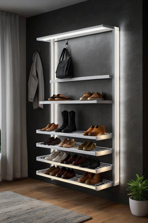 A floating shoe rack keeps footwear organized while adding a modern flair. Integrated LED lights highlight the rack and make it easy to find shoes, even in dim lighting. This type of installation is perfect for small foyers because it keeps the floor clear and creates a visually striking, contemporary look.