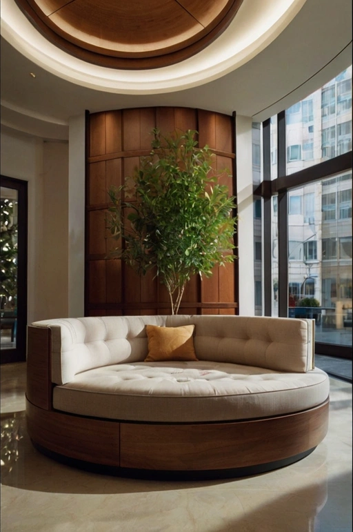 A circular cushioned seating pod adds both comfort and futuristic charm. It’s perfect for pausing to put on or remove shoes and provides a cozy, inviting spot in the center of the foyer. This design works especially well in modern homes or spaces looking for a unique, sculptural feature.