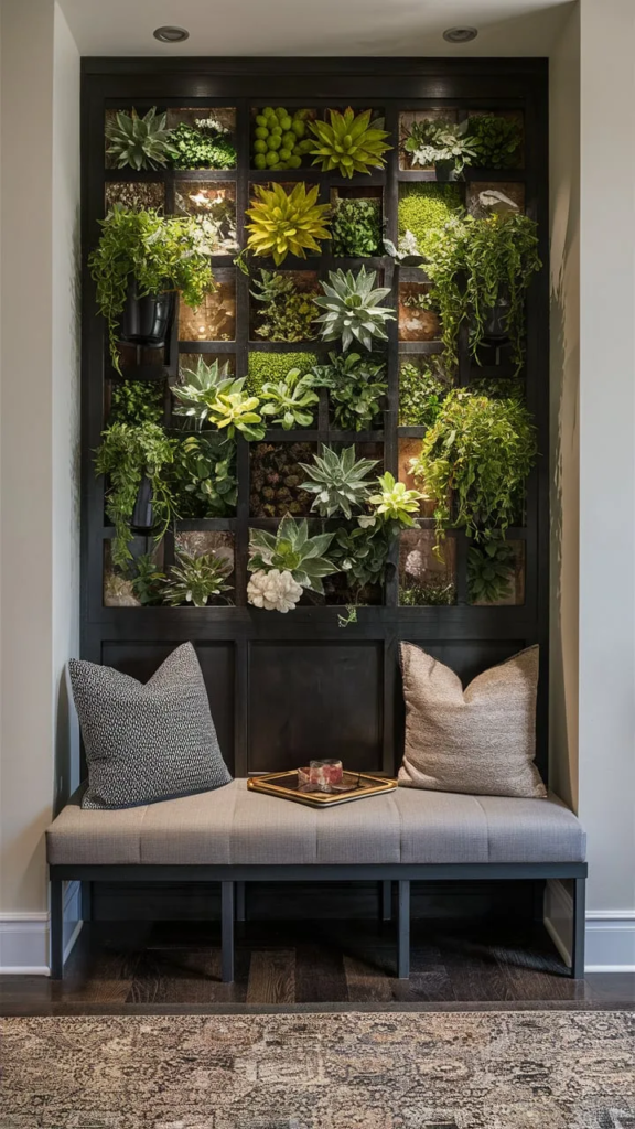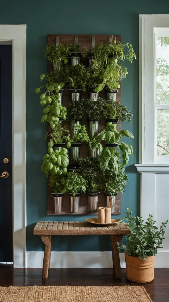 A vertical herb garden introduces greenery while also offering utility. Fresh basil, mint, or rosemary right at the entryway can bring a natural scent and visual appeal. It’s a simple yet effective way to blend decor and practicality, creating a refreshing, earthy vibe from the moment you enter.