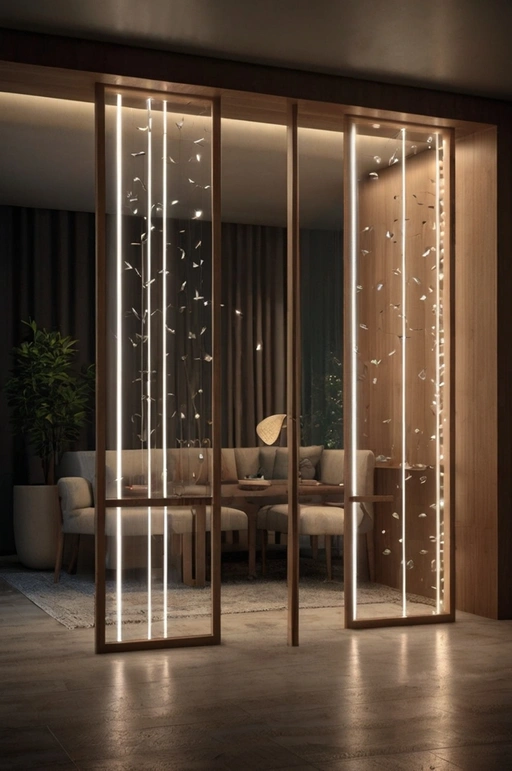 A transparent partition with built-in lights acts as both a divider and a design element. It maintains an open, airy feeling while subtly defining zones in the entryway. The lights create ambiance and draw attention without overwhelming the space. This setup works beautifully in modern or minimalistic interiors.