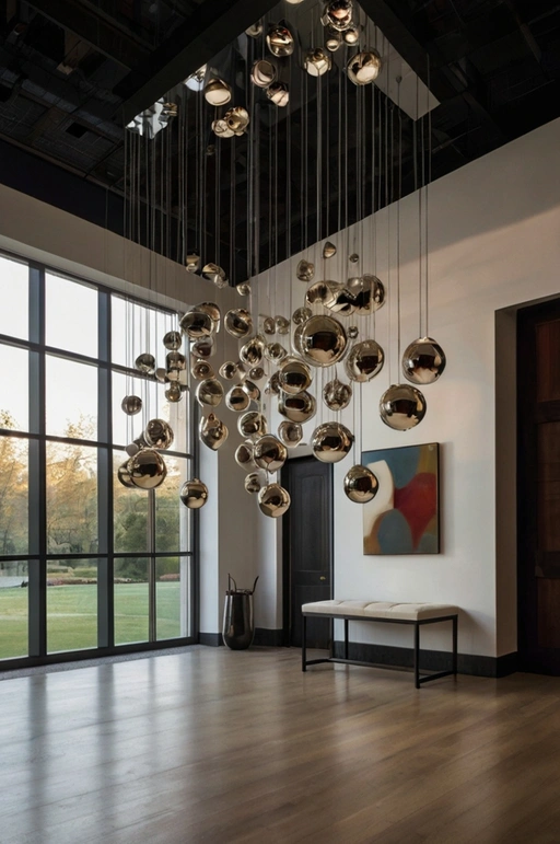 Hanging sculptures or kinetic mobiles above the foyer add movement and elegance. These suspended installations draw the eye upward, creating a dynamic visual element that changes as air moves through the space. It’s perfect for foyers with high ceilings.