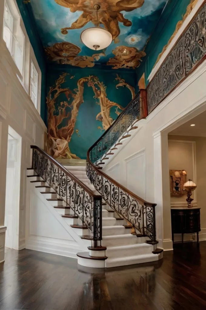 Ceilings are often neglected, but adding a hand-painted mural can completely transform the space. Whether it’s an abstract design, a botanical scene, or a subtle geometric pattern, a ceiling mural draws the eye upward and creates a unique, unexpected focal point. Guests are immediately captivated, and even the smallest foyer can feel more expansive with the added visual interest overhead.