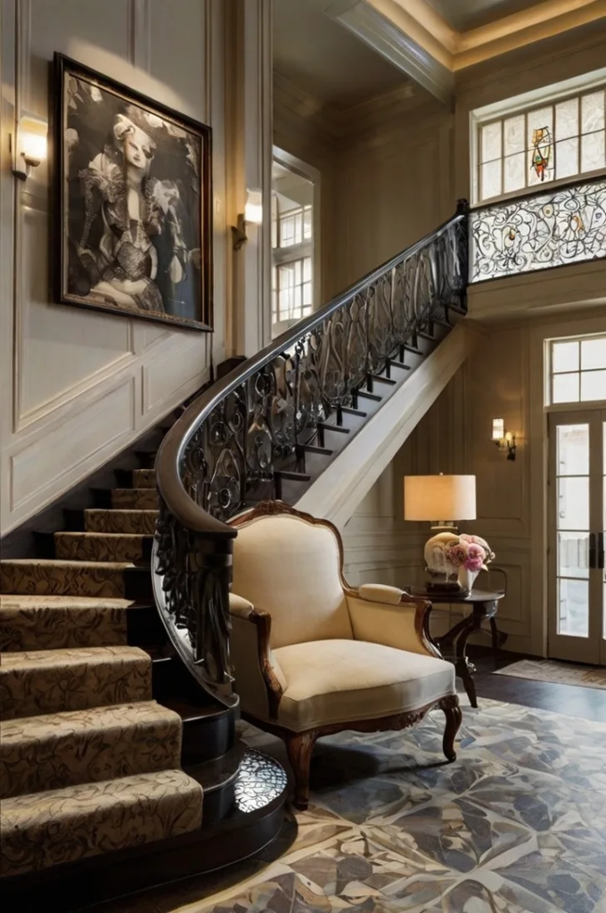 If your foyer includes a staircase, the sides of the steps are a prime spot for artistic expression. Patterned decals, painted designs, or even mosaic tiles can create a striking visual statement. This approach adds charm and personality without taking up extra floor space. Staircase art is particularly effective in homes where the entryway is narrow, offering a design element that doesn’t interfere with functionality.