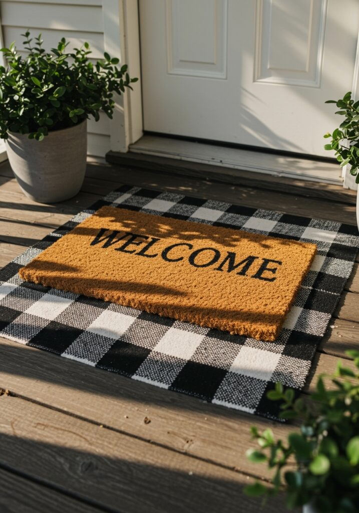 This idea explains how layering a decorative rug with a functional doormat adds style and depth. It highlights how this small detail can instantly upgrade the entrance, making it a simple yet trendy Front Porch Idea.