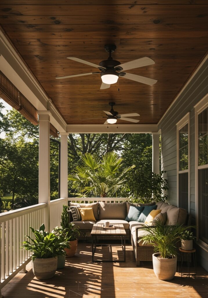 This paragraph emphasizes the practical benefits of adding a ceiling fan, especially in warm climates. It explains how it improves comfort and helps keep insects away, making it one of the most useful Front Porch Ideas.
