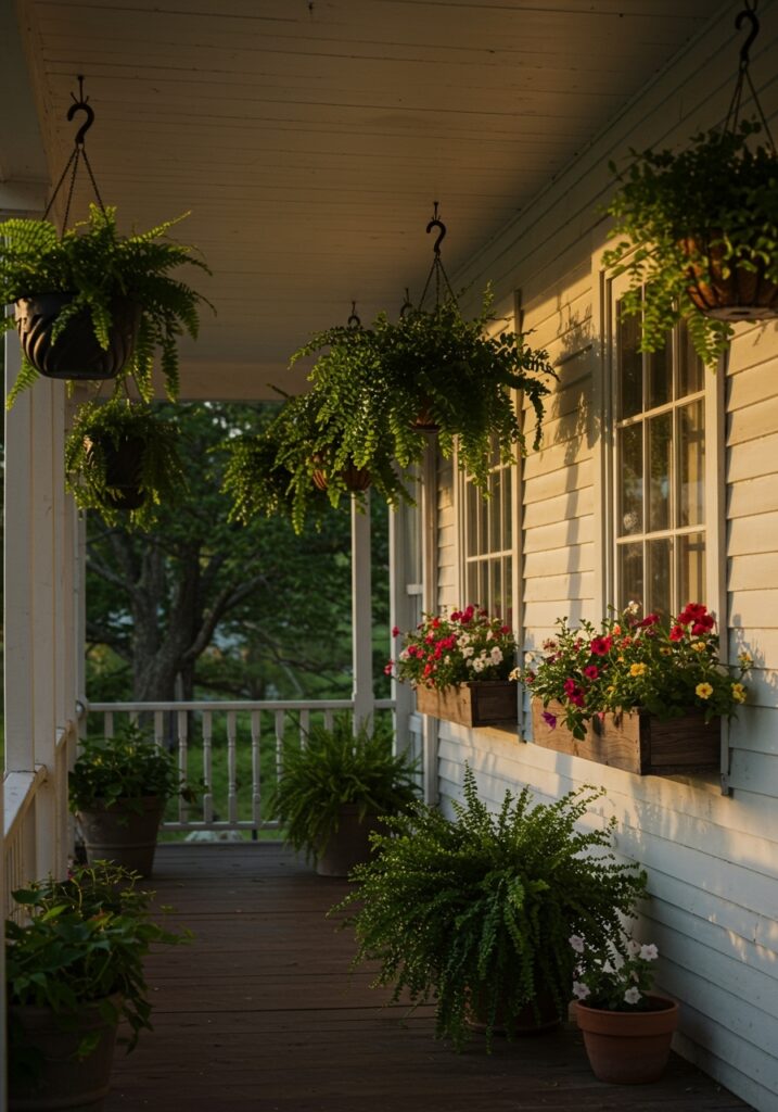 This section describes how adding plants at different heights enhances the space. It explains how hanging baskets and window boxes bring color and charm, making these Front Porch Ideas feel fuller and more dynamic.