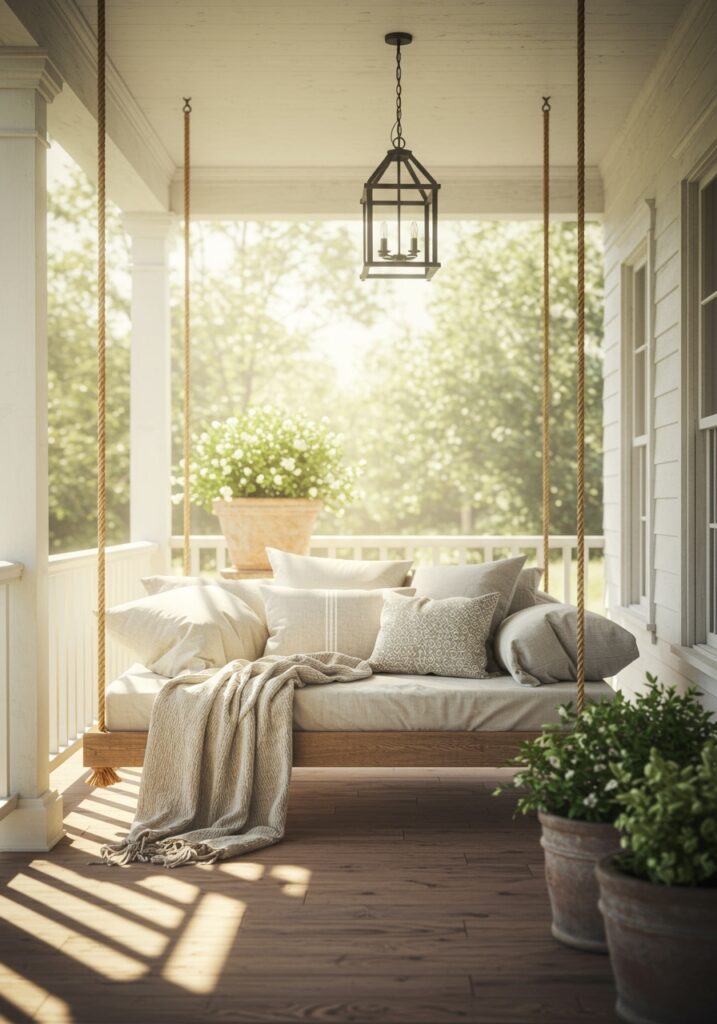 This section focuses on adding a swing or hanging bed to create a relaxing vibe. It explains how a simple swing offers comfort, while a larger hanging bed takes things further by adding a luxurious feel. These Front Porch Ideas are all about relaxation and making the porch more enjoyable.