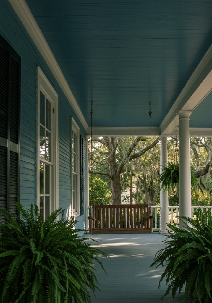 This paragraph introduces the idea of painting the porch ceiling a soft blue shade. It explains both the traditional belief behind it and its practical benefits, such as helping reduce insects. It shows how small design choices in Front Porch Ideas can be both stylish and functional.