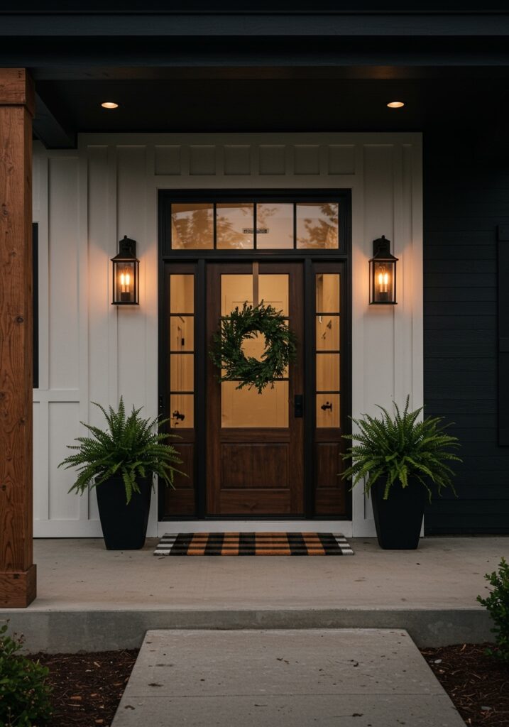 This idea focuses on a clean and popular style using neutral colors and a mix of metal and wood. It explains how simple decor elements can create a polished and welcoming look, making it one of the most loved Front Porch Ideas for a balanced design.