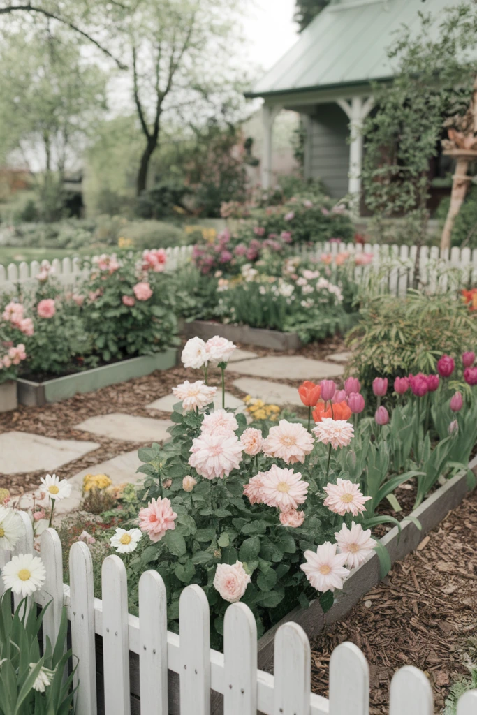 Layering flowers by height produces a full and textured look. Picket fences and climbing roses enhance the cozy cottage atmosphere.