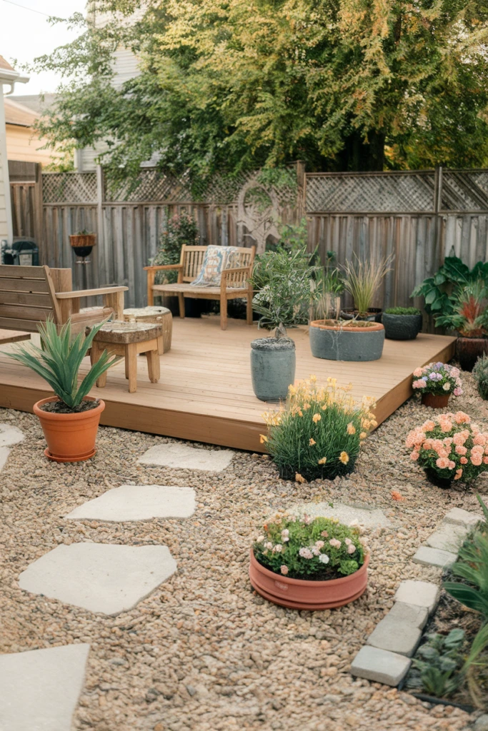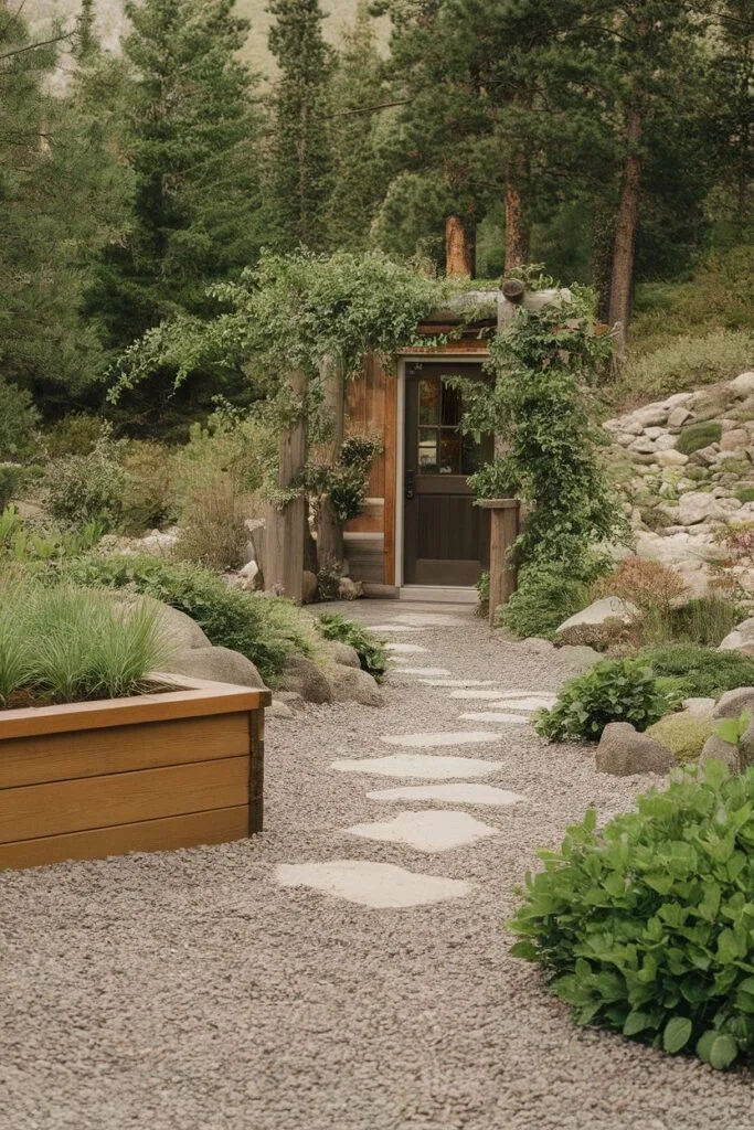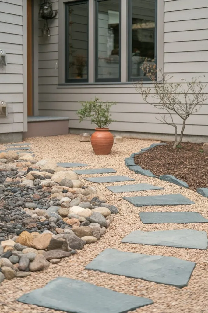Gravel paths and mulch beds reduce weeds while keeping the yard tidy. A small decorative feature such as a bench or birdbath can serve as the focal point.