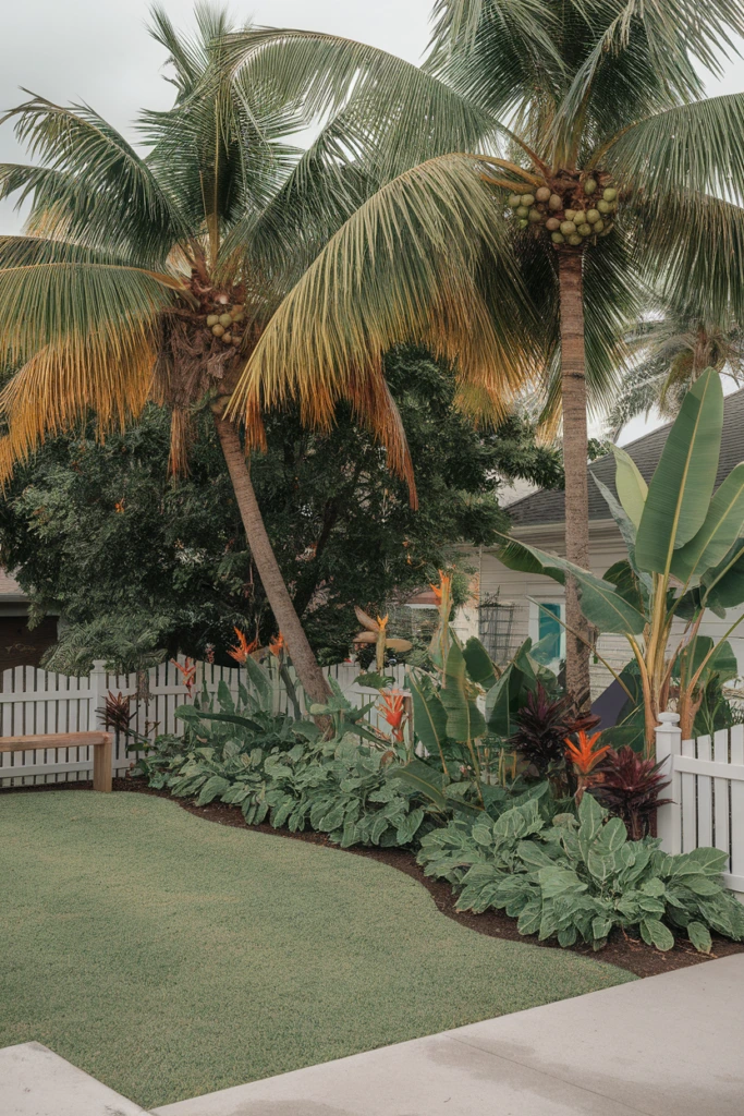 Tropical front yard landscaping ideas introduce lush greenery and vibrant colors. Palms, hibiscus, and bird-of-paradise plants bring an exotic atmosphere to the space.