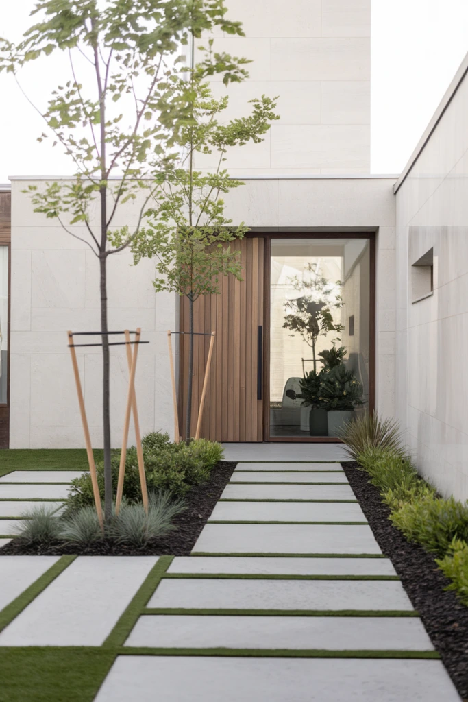 Modern front yard landscaping ideas focus on clean lines and minimal design. Geometric pathways, concrete tiles, and structured planting beds create a sleek appearance.
