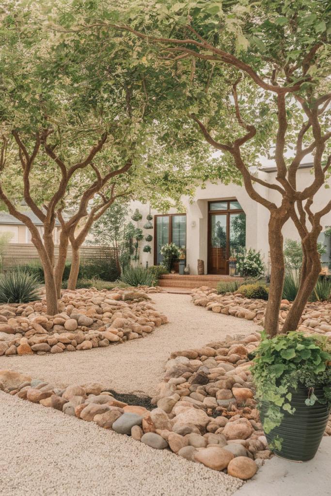 Desert-style front yard landscaping ideas focus on water conservation while creating a unique and stylish outdoor look. Gravel, sand-toned stones, and drought-tolerant plants replace traditional lawns to reduce water usage.