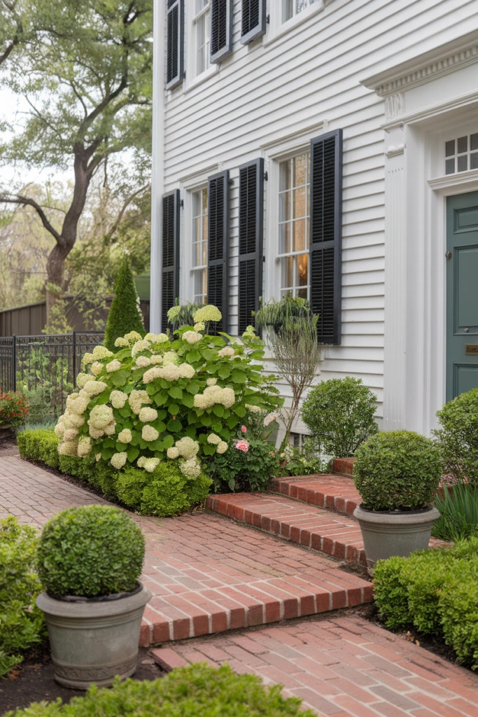 Colonial-inspired front yard landscaping ideas emphasize symmetry and timeless materials. Brick or cobblestone paths leading to the front door create a classic and durable design.