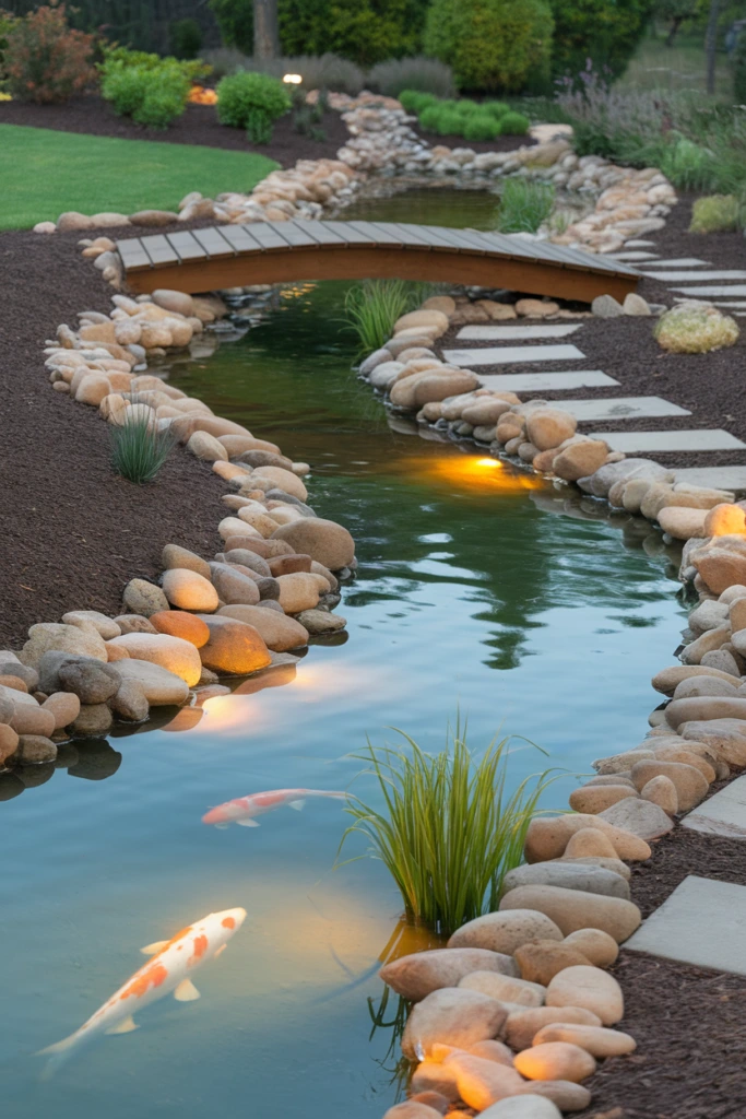 Stepping stones or small bridges across the stream increase visual interest and accessibility. Lighting around the water feature enhances the effect at night.