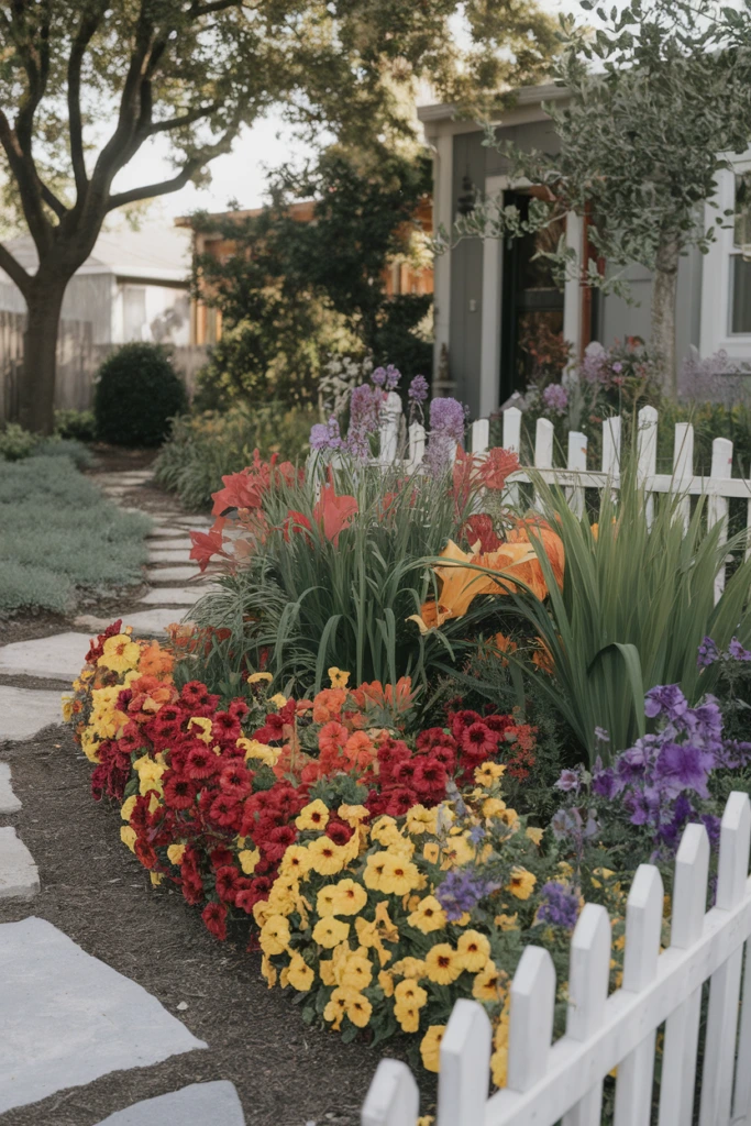 Bright flower beds are striking front yard landscaping ideas that bring personality to a property. Vibrant blooms like dahlias, marigolds, or zinnias instantly capture attention and energize the space.