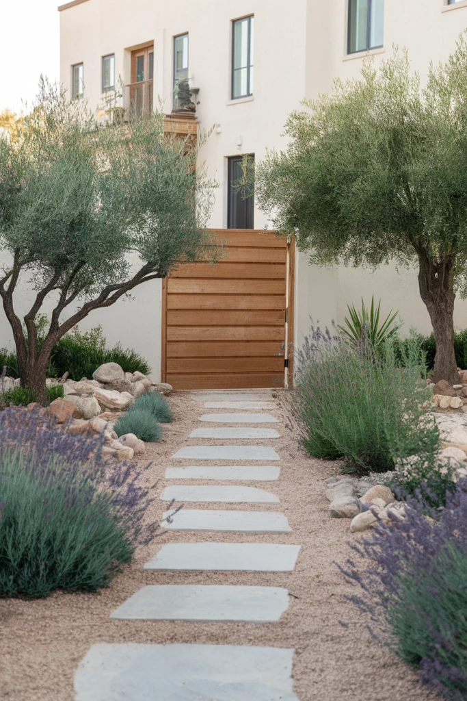Mediterranean-inspired front yard landscaping ideas bring warmth and character to outdoor spaces. Plants like olive trees, lavender, and colorful flowers placed in terracotta pots help create a relaxed and charming atmosphere.