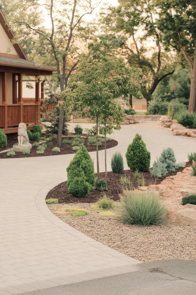 A stone walkway is a timeless element in many front yard landscaping ideas because it naturally guides visitors toward the entrance. Materials like flagstone or modern pavers create structure while adding texture to the yard.
