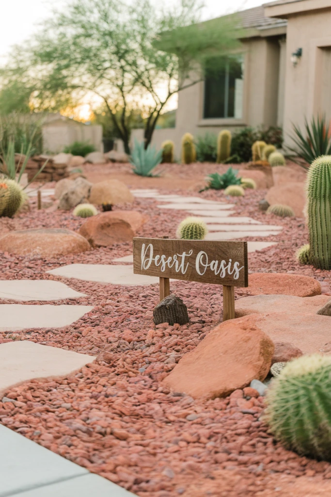Plants such as agave, aloe, or cacti bring character to the design while requiring very little maintenance. Decorative elements like boulders or stepping-stone paths complete the natural desert aesthetic.