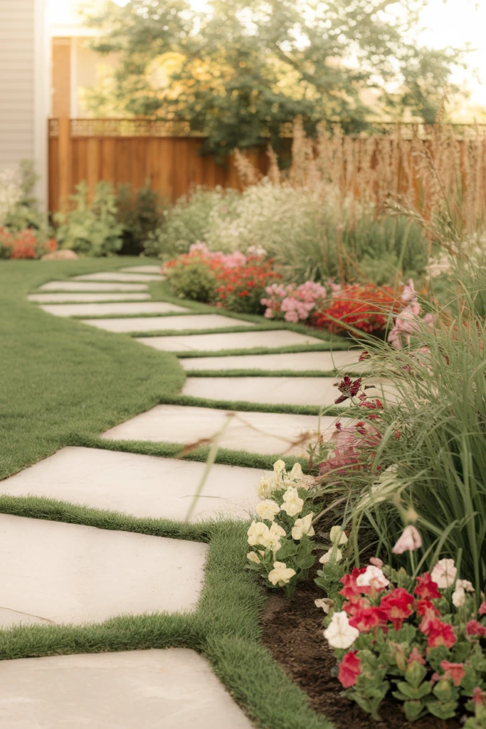 Stepping stones surrounded by moss or ground cover help the pathway blend naturally with the surroundings. Small flowering plants can add subtle color along the edges.