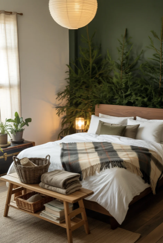 Adding a rustic bench at the foot of the bed can also be practical. It provides a place to store baskets or books while contributing to the cozy and layered aesthetic of the room.