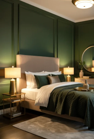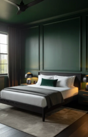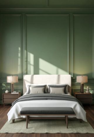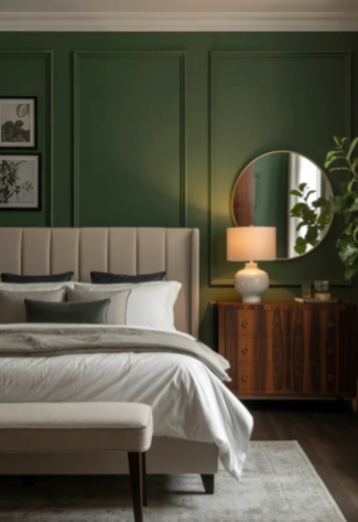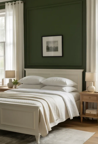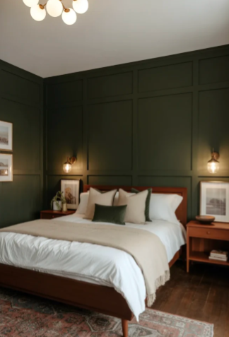 Adding paneled walls in deep forest green can instantly give a bedroom a bold and polished appearance. When paired with crisp white molding or trim, the contrast highlights the richness of the green color and makes the room feel modern and refined.