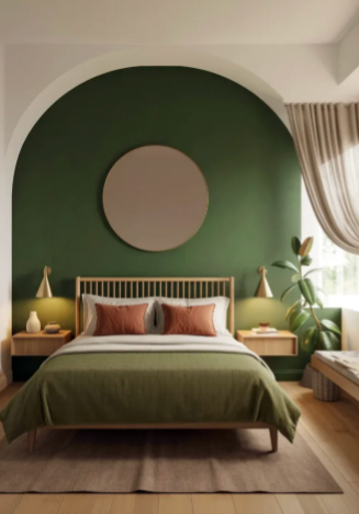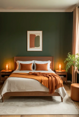 Warm orange tones such as burnt orange or terracotta pair beautifully with deep green walls. These colors bring energy and warmth to the bedroom.