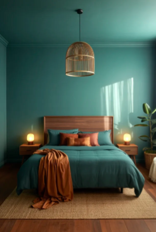 Teal-leaning green walls can create a dramatic backdrop while still feeling natural and comfortable. When paired with rattan lighting or woven textures, the space gains a relaxed and earthy character.