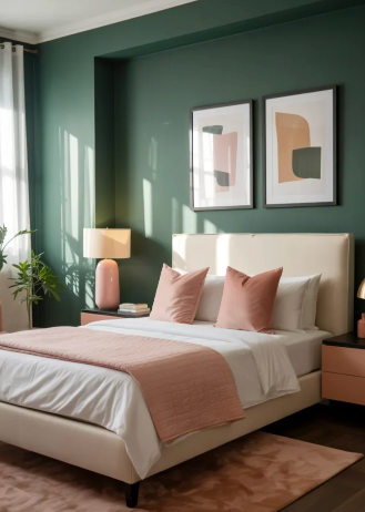 Pink accents can beautifully highlight the richness of dark green tones. Even small touches like blush pillows or soft rose décor can brighten the entire room.