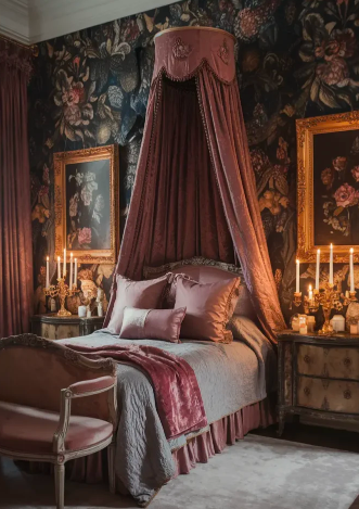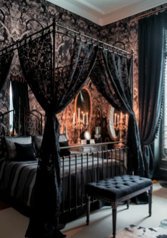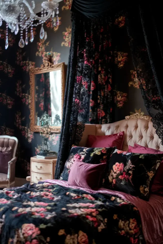 A dark coquette-style bedroom blends softness and sophistication. Think plush fabrics, vintage furniture, and moody lighting. Deep floral prints, black lace curtains, and ornate mirrors bring in a sense of mystery and romance that makes the space feel uniquely elegant.