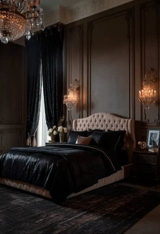 Soft fabrics like velvet or linen prevent the space from feeling stark, and natural elements such as wood or stone add warmth. A statement chandelier or bold lighting completes a glamorous, cohesive dark feminine bedroom.