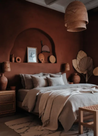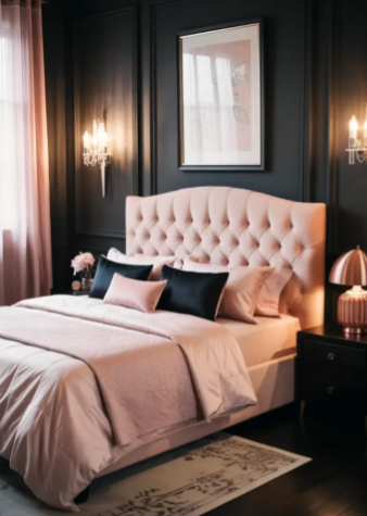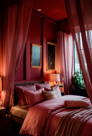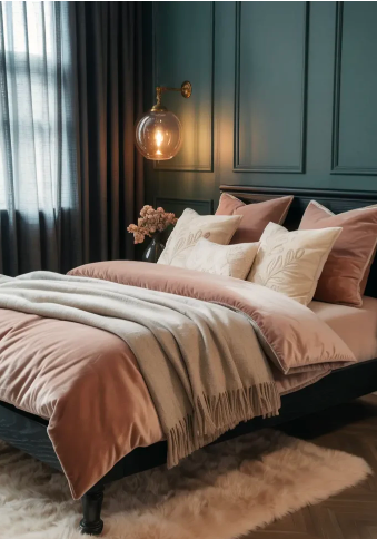 Shades like dark blush, cranberry, and deep mauve walk the line between romantic and moody. Layering bedding in velvet, silk, and cotton adds richness, while soft lighting such as bedside lamps or chandeliers enhances the dreamy atmosphere.